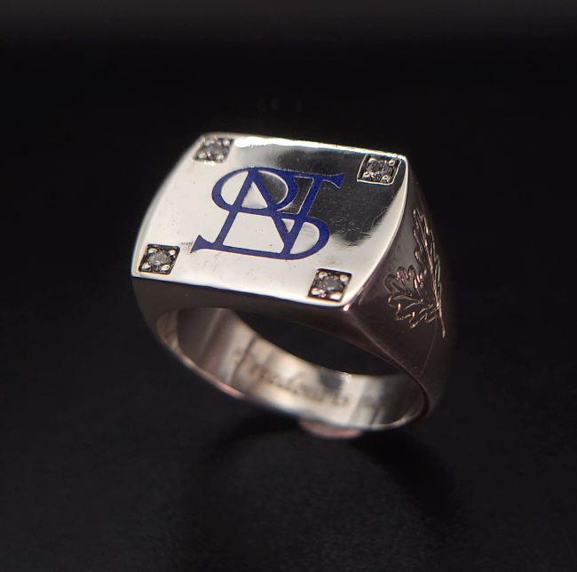 Cette bague commandé par un marine représente les 4 points cardinaux avec une gravure émaillée au centre et 4 diamants sertis. Une feuille de chêne gravé à la main sur les côtés et d'autres détails : un condensé de possibilités